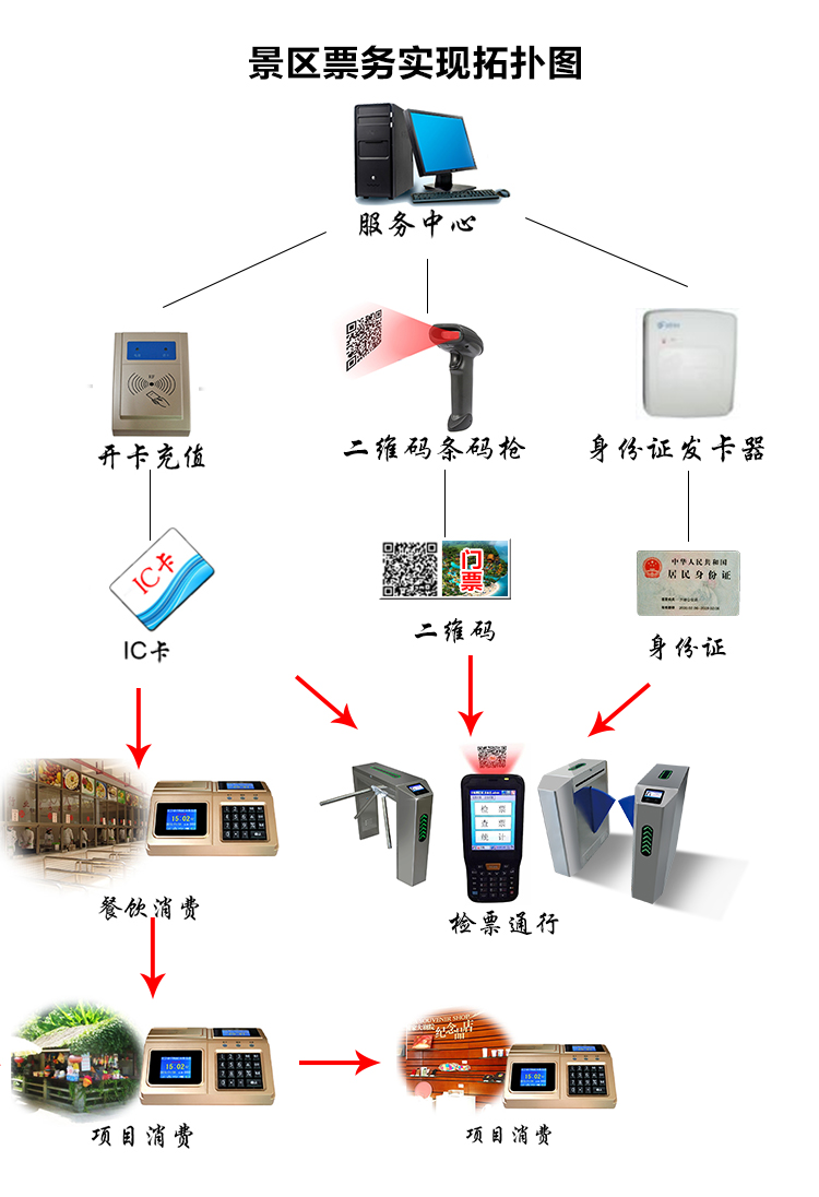 景區票務系統運用于旅游景區、主題公園、博覽會、展覽館等應用領域。游客到達景區售票點購買門票,在售票過程中同時售票數據被寫入服務器數據庫中。游客持ID/IC卡、一維碼、二維碼,或者二代身份證,這些類型的門票介質到景區入口,經過通道閘驗票通行,門票僅有一次驗票機會,游客安全進入景區。售票數據和驗票進門數據在授權的情況下可實時查詢,各種財務報表可實時查詢、打印。